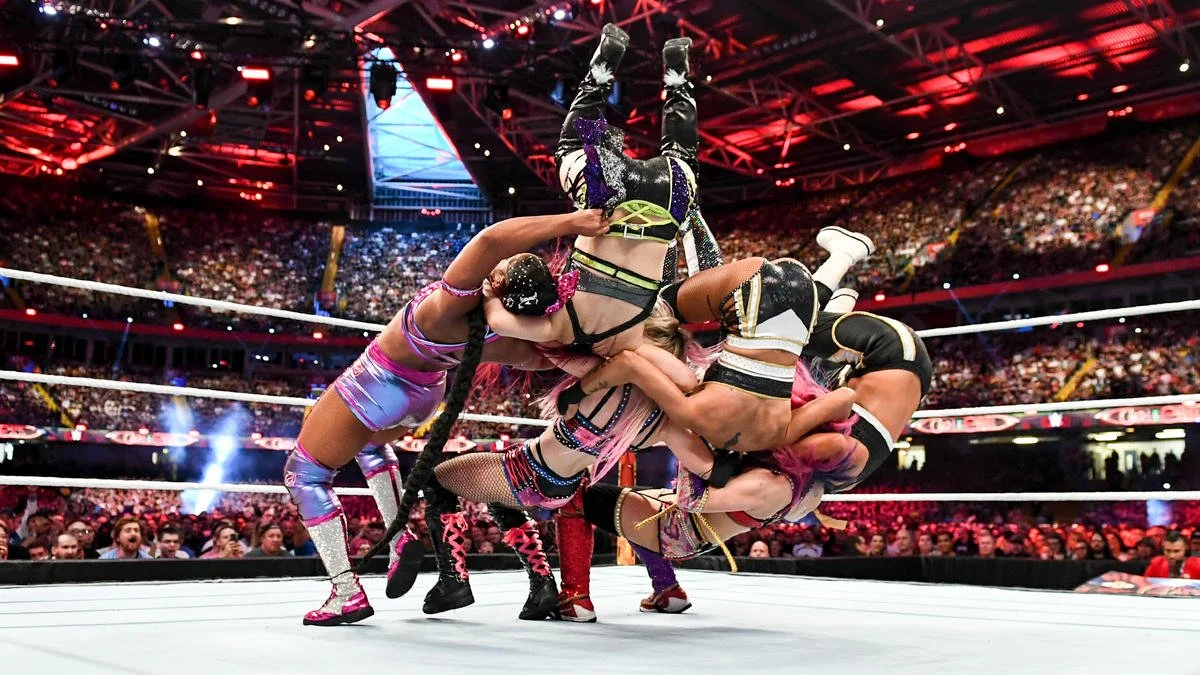 Οι Asuka και Bliss θα πατήσουν στην πλάτη της Belair και με ένα Superplex θα γκρεμίσουν την Bayley από το πάνω σκοινί